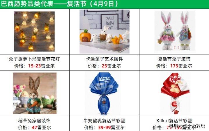 此外,巴西人也有过复活节(4月9日)的传统,届时兔子、鸡蛋元素的家居装饰摆件将成为潮流单品,餐饮和厨具等相关品类也要开始上新节日的氛围产品了,这些季节性商品的需求会在狂欢节之后开始攀升。