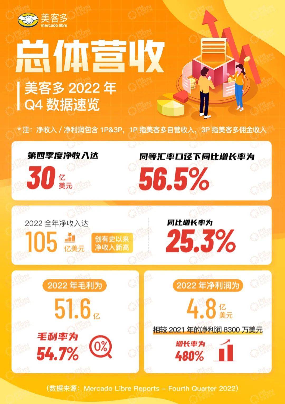 近期,美客多发布了2022年第四季度及全年财报。据财报显示,美客多2022年全年创下营收105.37亿美元,同期增长49%;营业利润为10.34亿美元,同期增长134.5%;净利润为4.82亿美元,同期增长480%。