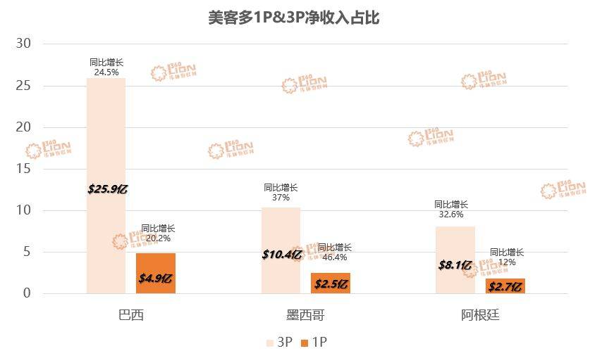 单从1P和3P净收入来看,墨西哥的增长比率也足以显现其整体电商市场的发展潜力(注:1P指美客多自营收入,3P指美客多佣金收入):