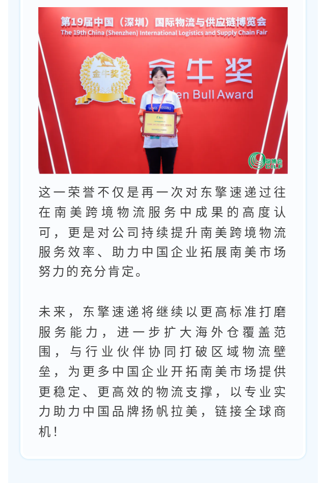 东擎速递精彩亮相2025中国物博会,实力斩获“金牛奖”,彰显拉美跨境物流硬实力!